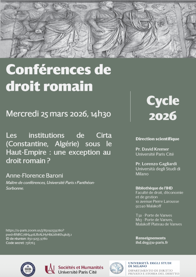 Troisième conférence du cycle 2026 des Conférences de droit romain, coordonné par le Professeur David Kremer (Université Paris Cité), en partenariat avec le Professeur Lorenzo Gagliardi (Università degli Studi di Milano).