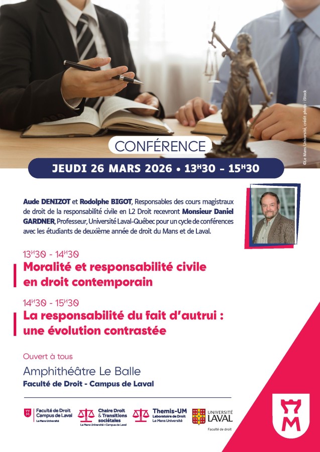 Conférence organisée par le THEMIS, la chaire Droit et transitions sociétales, Faculté de droit, Université du Mans et la faculté de droit de l'Université Laval - Québec sous la direction scientifique de Madame Aude Denizot et Monsieur Rodolphe Bigot, Responsables des cours magistraux de droit de la responsabilité civile en L2