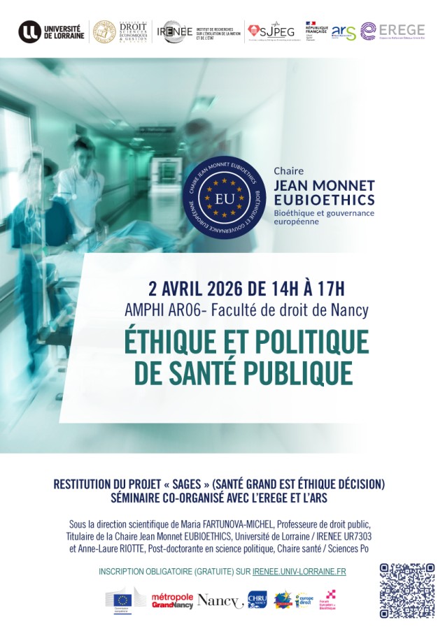 Séminaire organisé par l'IRENEE, Université de Lorraine sous la direction scientifique de Maria Fartunova-Michel, Professeure de droit public, Titulaire de la Chaire Jean Monnet EUBIOETHICS, Université de Lorraine / IRENEE UR7303 et Anne-Laure Riotte, Post-doctorante en science politique, Chaire santé / Sciences Po