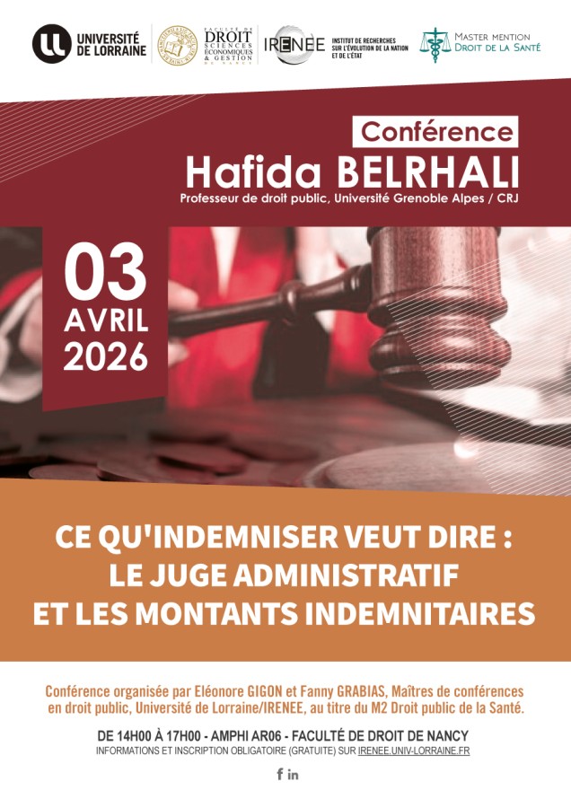 Conférence organisée par l'IRENEE, Université de Lorraine sous la direction scientifique d'Eléonore Gigon et Fanny Grabias, MCF en droit public, Université de Lorraine/IRENEE, au titre du M2 Droit public de la Santé