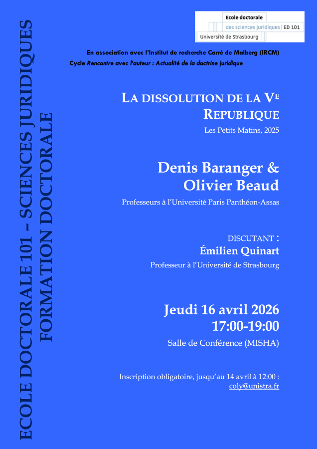 Conférence organisée par l'Ecole doctorale des sciences juridiques - ED 101, Université de Strasbourg, en association avec l’Institut de recherche Carré de Malberg (IRCM), dans le cadre du cycle Rencontre avec l’auteur : Actualité de la doctrine juridique