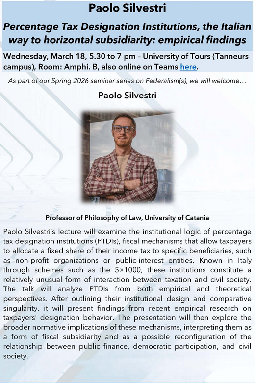 Paolo Silvestri's lecture will examine the institutional logic of percentage tax designation institutions (PTDIs), fiscal mechanisms that allow taxpayers to allocate a fixed share of their income tax to specific beneficiaries, such as non-profit organizations or public-interest entities. Known in Italy through schemes such as the 5x1000, these institutions constitute a relatively unusual form of interaction between taxation and civil society. The talk will analyze PTO's from both empirical and theoretical perspectives. After outlining their institutional design and comparative singularity, it will present findings from recent empirical research on taxpayers' designation behavior. The presentation will then explore the broader normative implications of these mechanisms, interpreting them as a form of fiscal subsidiarity and as a possible reconfiguration of the relationship between public finance, democratic participation, and civil society.