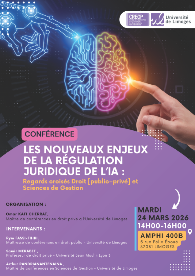 Conférence organisée par le CREOP (Centre de Recherches sur l’Entreprise, les Organisations et le Patrimoine), Université de Limoges sous la direction scientifique de Omar Kafi Cherrat, MCF en droit privé à l'Université de Limoges