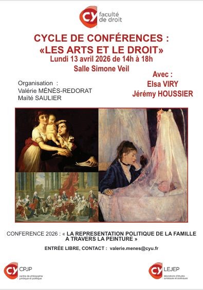 Conférence organisée par le CPJP, le LEJEP, la Faculté de droit, CY Cergy-Paris Université dans le cadre du cycle "Les Arts et le Droit" sous la direction scientifique de Valérie Ménès-Redorat et Maïté Saulier, Maîtresses de Conférences en droit, CPJP & LEJEP Cergy Paris Université