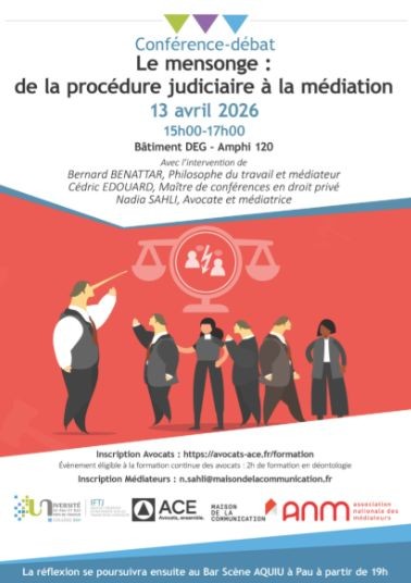 Conférence débat organisée par l'IFTJ, Université de Pau et pays de l'Adour sous la direction scientifique de Nadia Sahli et Cédric Edouard en partenariat avec l'Association Nationale des Médiateurs, la Maison de la communication de Pau et l'association "ACE, Avocats ensemble"
