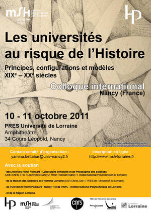 Résumé Le temps de la controverse est propice à un retour aux principes fondateurs. Alors que s’enchaînent depuis des dizaines d’années les modalités de réformes de l’université française, émerge de façon souvent polémique la question des «modèles universitaires». Ce colloque international et interdisciplinaire aura lieu à Nancy en octobre prochain. Le programme et le formulaire d'inscription en ligne (ouvertes) sont disponibles. Co-organisé par les Archives Henri Poincaré et la MSH Lorraine, il se situe dans le cadre des travaux de recherche de l'axe 6 Sciences et cognition de la MSH, et plus précisément le projet HISE «Institutions scientifiques et éducatives: recherches socio-historiques et comparaisons internationales».
