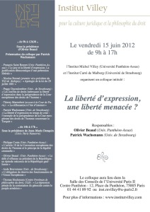 Parisvendredi 15 juin 2012L'Institut Michel Villey (Université Panthéon-Assas) et l’Institut Carré de Malberg (Université de Strasbourg) organisent le vendredi 15 juin 2012 un colloque intitulé: La liberté d’expression, une liberté menacée ?