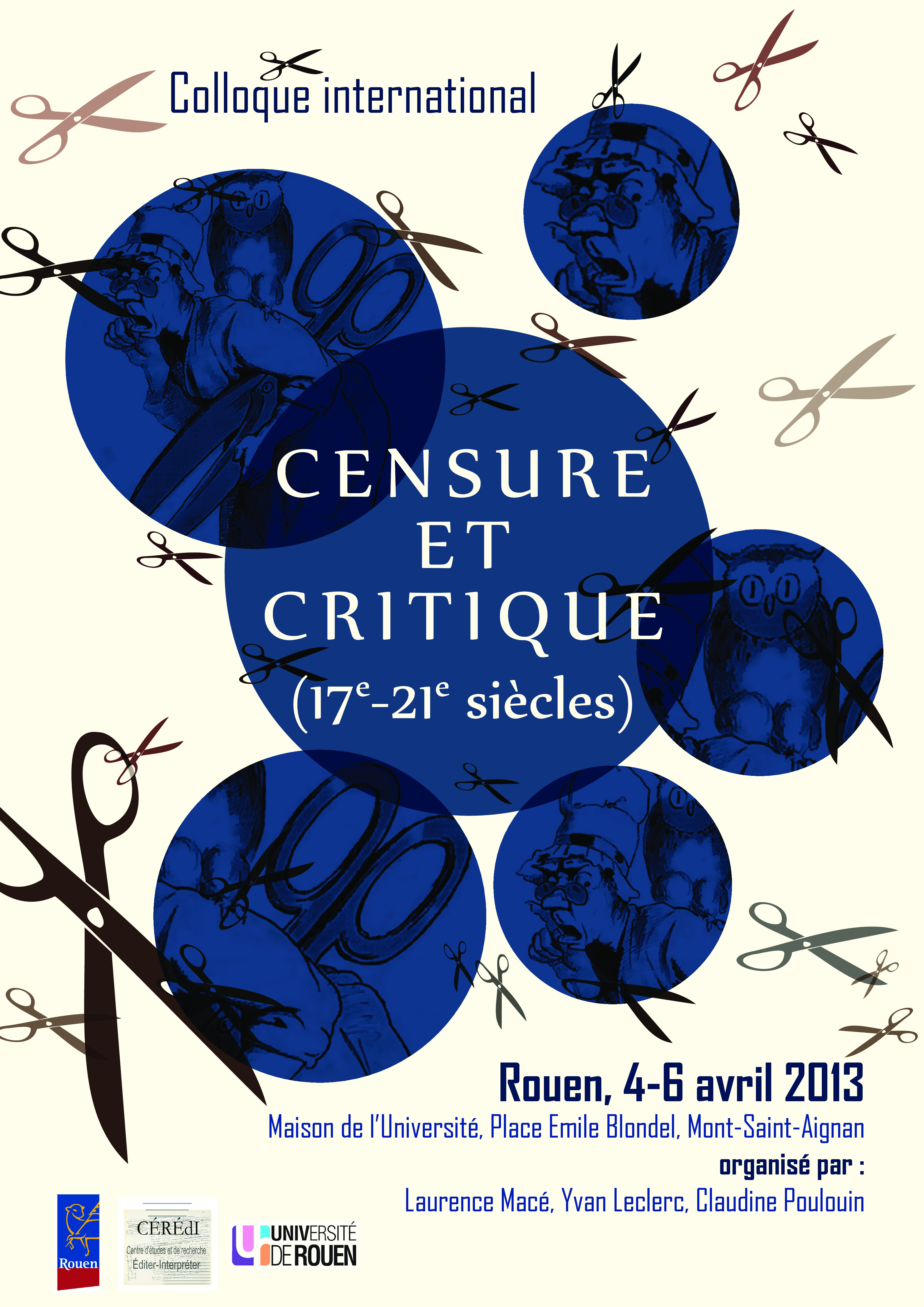 Depuis l’ouvrage de Reinhart Koselleck, Le Règne de la critique (1959 ; trad. fr., Minuit, 1979), la censure et la critique apparaissent comme deux concepts a priori irréconciliables. Pour les spécialistes de la pensée classique, la critique serait née des guerres de religion et de la dichotomie opérée par la raison d’État entre le for intérieur et l’action extérieure. Elle se serait développée chez les élites contre les lois de l’État, considérant tout pouvoir de ce dernier – la censure la toute première – comme un abus du dit pouvoir. Pareil schéma tend à faire apparaître censure et critique comme deux activités radicalement antagonistes, et les hommes qui les pratiquent comme des étrangers et des adversaires, inaccessibles aux logiques les uns des autres.Or depuis quelques années, les historiens ont commencé à envisager la censure de manière différenciée, rappelant qu’il existe non pas une censure mais des formes de censure ecclésiastique/laïque(s) et surtout que diachroniquement, les règlements et les pratiques évoluent qui, dans le cas de la censure laïque française par exemple, modifient parfois considérablement l’esprit même de cet acte. D’autres études ont avancé que, dans la France des Lumières, cet outil de l’État ‘moderne’ contribua à la structuration de l’espace public au moment où celui-ci émergeait, la censure laïque s’imposant finalement dans la France du 18e siècle – à certains moments au moins – comme l’alliée objective des Lumières. Pour le 19e siècle et le 20e siècle, en revanche, des travaux plus récents situés au croisement de la littérature, de la sociologie et de la science politique ont interrogé « la responsabilité de l’écrivain » dans l’histoire de la liberté d’expression et plus généralement les rapports entre littérature, morale et droit.A partir de ces acquis, l’idée du colloque consistera à déplacer le questionnement dans le champ des études littéraires en interrogeant, à travers le prisme des rapports entre censure et critique et sur la longue durée (17e-20e/21e siècles) la censure comme forme de réception des textes. En jouant sur la polysémie du terme ‘critique’, plusieurs pistes seront envisagées dans le cadre de trois journées (6 sessions) précédées chacune de trois conférences de cadrage destinées à mettre en lumière le caractère pluridisciplinaire de la démarche adoptée et respectivement confiées à un historien de la littérature et des idées, à une sociologue et à un juriste. D’une part, on reviendra sur le sens étymologique du terme critique et on interrogera la fonction de structuration du champ littéraire jouée par la censure dans son traitement des textes et des auteurs et/ou dans le discours qu’elle tient sur eux. D’autre part, on questionnera les liens divers entre censure et critique littéraire et la porosité parfois observable entre ces deux activités : on s’interrogera sur les ‘lieux’ institutionnels de cette improbable rencontre (notamment les académies, les périodiques…). D’un point de vue plus strictement littéraire, on se demandera comment censure et critique se positionnent quant aux différentes stratégies développées par les textes (l’ironie, le burlesque, les formes de discours rapportés), quelle place la censure fait aux normes génériques, si ses critères varient en fonction des genres (le théâtre, l’histoire par ex.). Enfin, dans l’optique des axes de recherche propres au CÉRÉdI, on questionnera plus généralement les pratiques herméneutiques des deux pratiques – censure et critique – au regard de la réception des textes.Dans le cadre d’un partenariat avec deux institutions culturelles rouennaises, deux activités ‘hors les murs’ – la visite de l’« Enfer » de la Bibliothèque Municipale de Rouen et une conférence en ville, gratuite et ouverte à tous, qui se tiendra à l’Auditorium du Musée des Beaux-Arts par Me Agnès Tricoire, docteur en Droit et avocat au Barreau de Paris – complèteront le programme.PROGRAMME