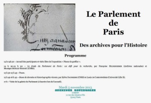 - 14h30-15h30 – Le fonds du Parlement de Paris: un défi pour la recherche, par Françoise Hildesheimer (Archives nationales) et Monique Morgat-Bonnet (CNRS).