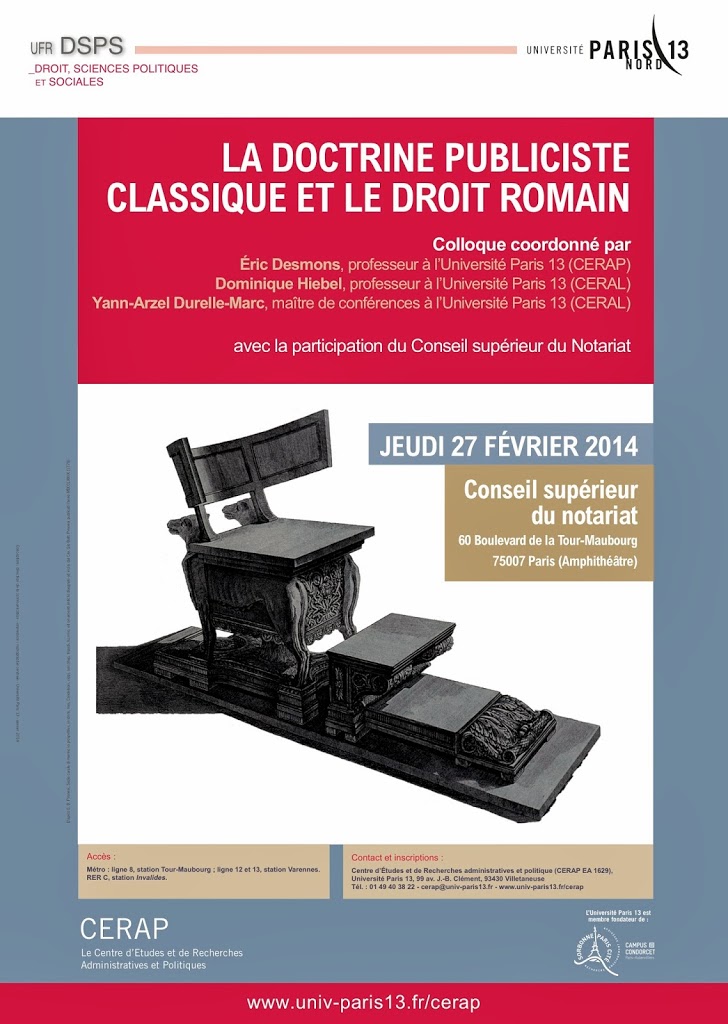 - 10h15. – Charles Reiplinger, maître de conférences à l'Université Paris 13 : Le droit romain et la doctrine publiciste anglo-saxonne.