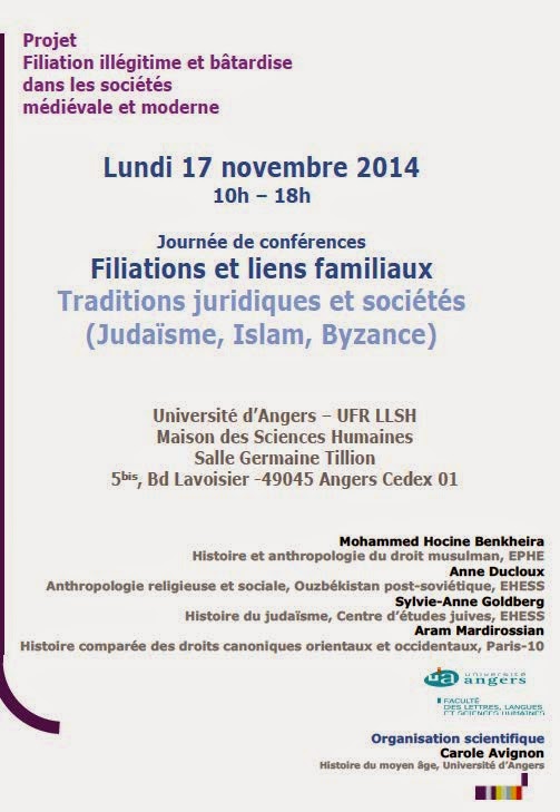Information transmise par A. Dobigny-Reverso:Université d’Angers – UFR LLSHMaison des Sciences HumainesProjet Filiation illégitime et bâtardise dans les sociétés médiévale et moderneJournée de conférencesFiliations et liens familiauxTraditions juridiques et sociétés(Judaïsme, Islam, Byzance)Angers17 novembre 2014 (10h-18h)Organisation scientifique