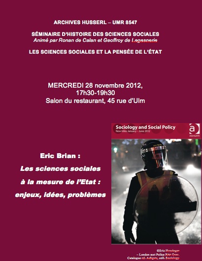 - Séance 2, le Mercredi 28 novembre 2012 : Eric Brian, Directeur d’études à l’EHESS. «Les sciences sociales à la mesure de l’Etat. Enjeux, idées, problèmes», 17h30-19h30, (45 rue d’Ulm, Paris 5e, salon du restaurant). Entrée libre