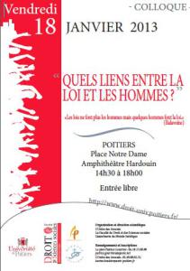 Poitiers18 janvier 2013 (14h30-18h)Colloque organisé par L'Ordre des Avocats, la Faculté de Droit et de Sciences sociales et L'aumônerie du Monde Juridique.