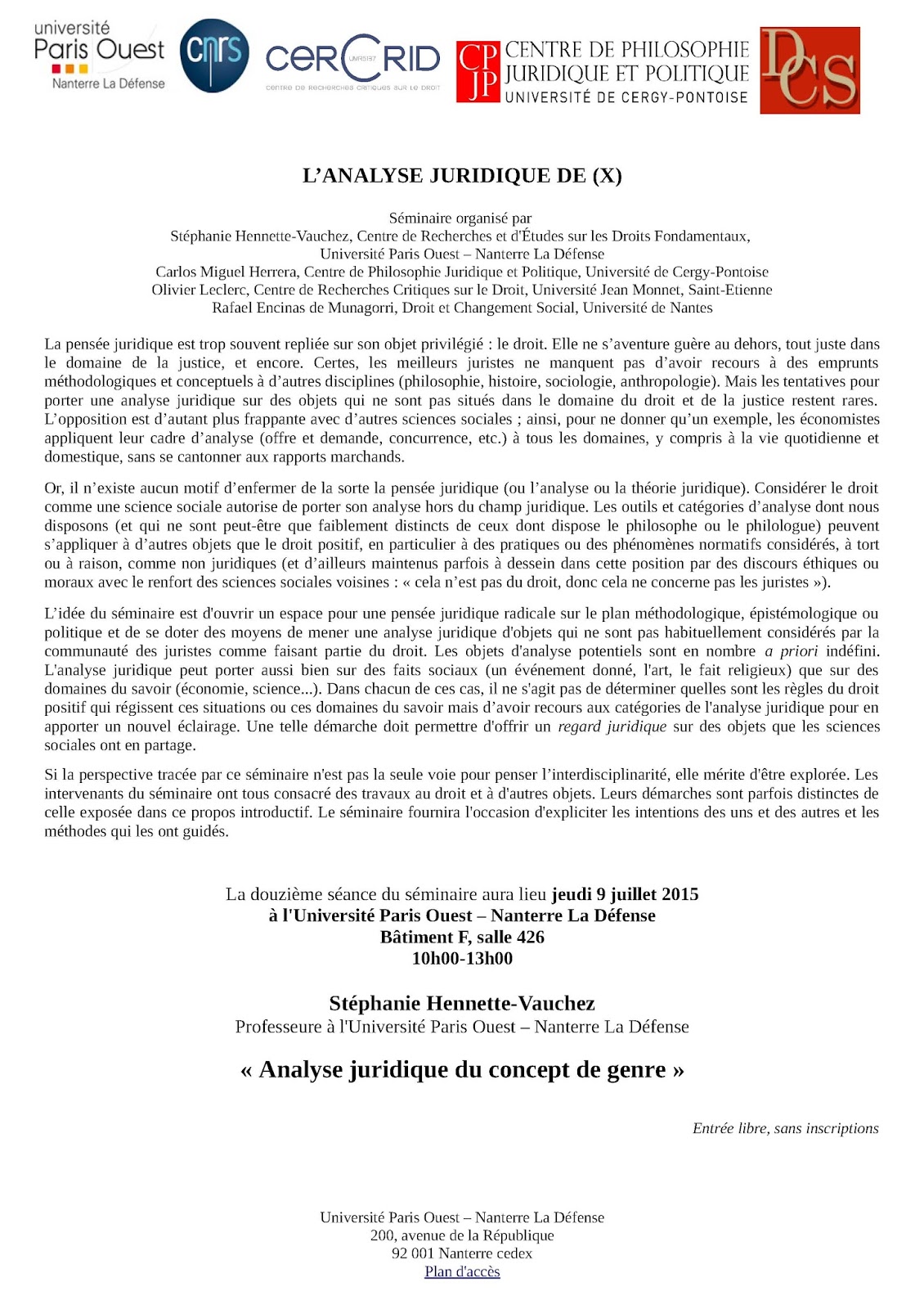 L’idée du séminaire est d'ouvrir un espace pour une pensée juridique radicale sur le plan méthodologique, épistémologique ou politique et de se doter des moyens de mener une analyse juridique d'objets qui ne sont pas habituellement considérés par la communauté des juristes comme faisant partie du droit. Les objets d'analyse potentiels sont en nombre a priori indéfini. L'analyse juridique peut porter aussi bien sur des faits sociaux (un événement donné, l'art, le fait religieux) que sur des domaines du savoir (économie, science...). Dans chacun de ces cas, il ne s'agit pas de déterminer quelles sont les règles du droit positif qui régissent ces situations ou ces domaines du savoir mais d’avoir recours aux catégories de l'analyse juridique pour en apporter un nouvel éclairage. Une telle démarche doit permettre d'offrir un regard juridique sur des objets que les sciences sociales ont en partage.