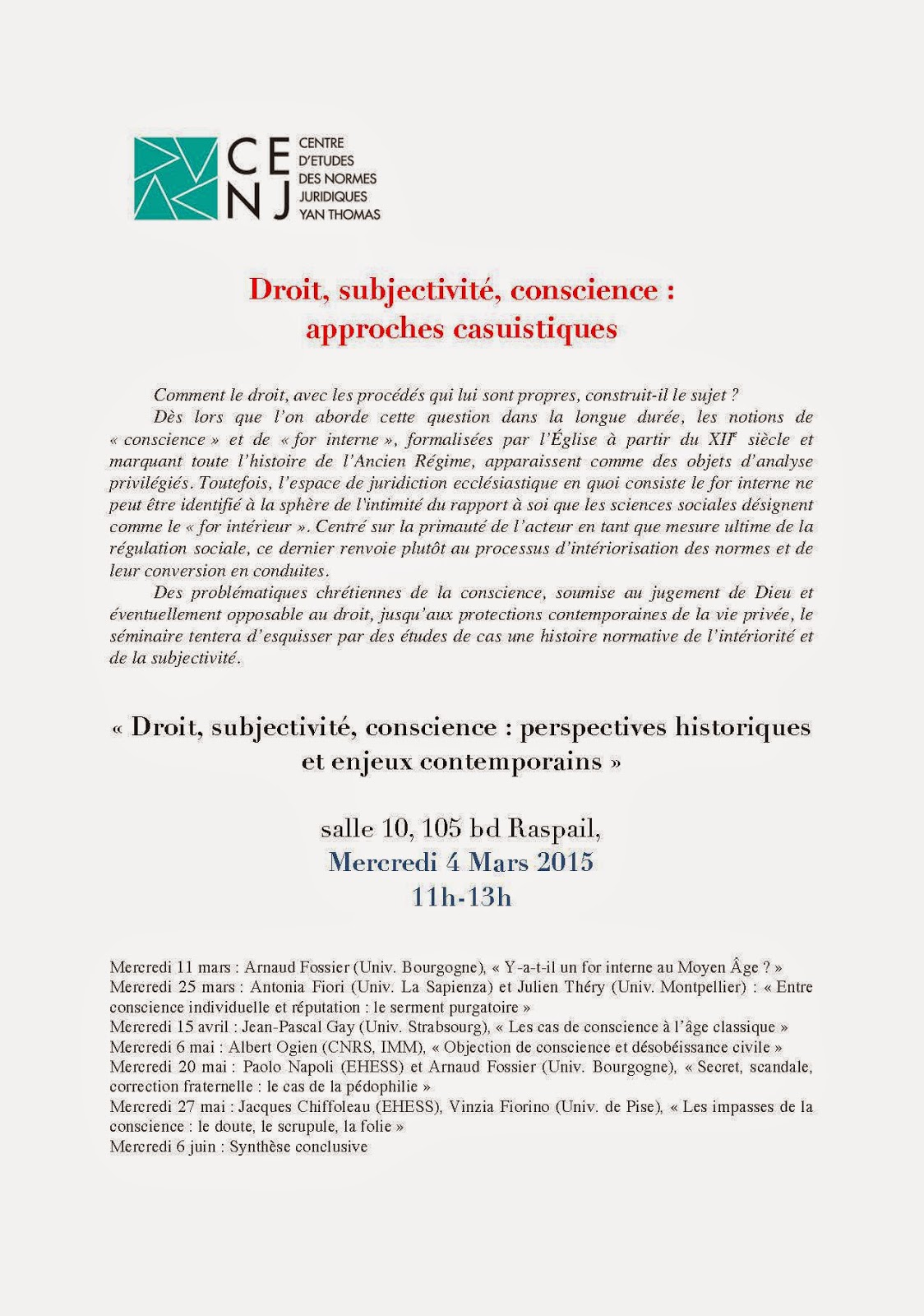 Des problématiques chrétiennes de la conscience, soumise au jugement de Dieu et éventuellement opposable au droit, jusqu’aux protections contemporaines de la vie privée, le séminaire tentera d’esquisser par des études de cas une histoire normative de l’intériorité et de la subjectivité.