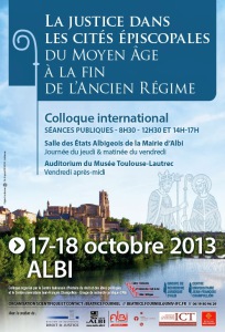 17-18 octobre 2013PrésentationCe colloque réunit historiens du droit et historiens, français et étrangers, autour du thème de l’administration de la justice ecclésiastique et laïque dans les cités épiscopales, du Moyen Âge à la fin de l'Ancien Régime.Plusieurs axes d'étude permettront de mettre en lumière les conditions de mise en œuvre de la justice dans un cadre particulier où cohabitaient bien souvent plusieurs pouvoirs distincts. Il s'agira ainsi de préciser les conditions de partage du pouvoir judiciaire entre ces différentes autorités tant ecclésiastiques -la justice spirituelle de l'évêque et des communautés religieuses de la ville- que laïques -la justice royale, la justice temporelle de l'évêque, les autres justices seigneuriales du lieu, la justice des communautés d'habitants-. Les intervenants montreront les divergences ne manquant pas d’exister entre royaumes chrétiens, mais aussi les particularismes locaux à l’intérieur même de ceux-ci.Cette étude de la justice sera également l’occasion de présenter l'organisation des juridictions spirituelles et temporelles des évêques d’Ancien Régime mais aussi de s’intéresser plus largement à la société des gens de justice par l’intermédiaire des titulaires du pouvoir juridictionnel et de leur entourage.