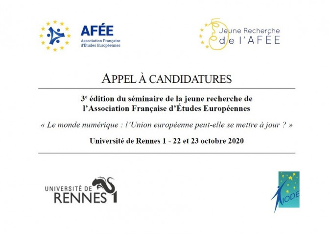 Dans le cadre de l’organisation annuelle du séminaire de la Jeune recherche, le réseau Jeune recherche de l’Association Française d’Etudes Européennes est heureux de vous inviter à participer à la 3e édition de ce séminaire qui se déroulera les 22 et 23 octobre 2020 à l’Université de Rennes.