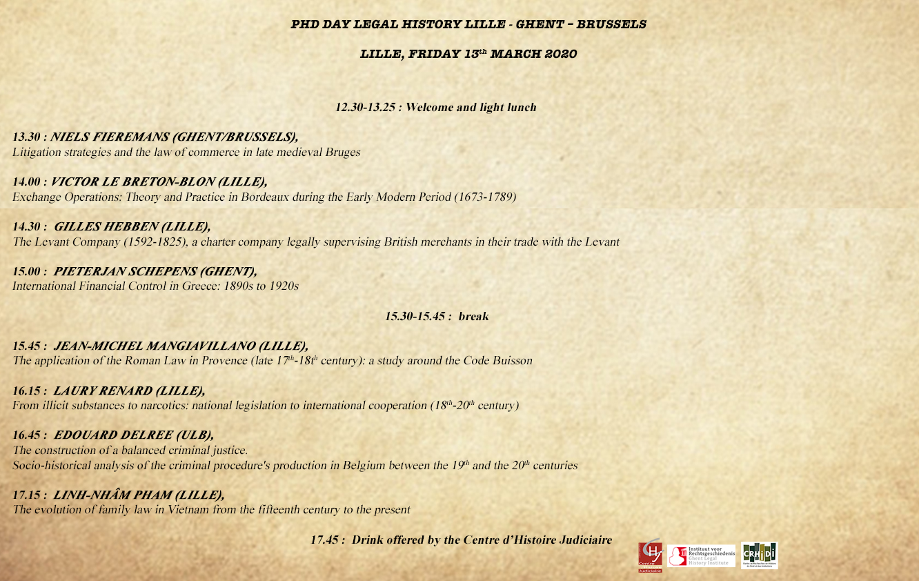 Journée de rencontre doctorants Brussels, Ghent, Lille organisé par le Ghent Legal History Institute, le CRHiDI et le Centre d'Histoire Judiciaire.