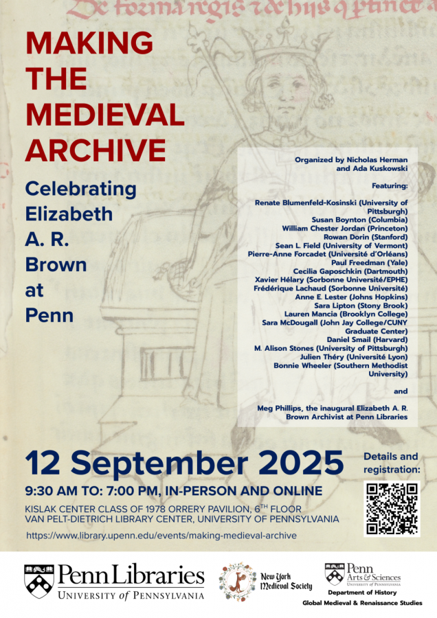 The day will also include an introduction to the research possibilities and historical interest of the medievalists' archive at Penn, presented by the Elizabeth A.R. Brown Archivist, an endowed position in the Kislak Center for Special Collections, Rare Books and Manuscripts. The day will conclude with reminiscences by friends, students, and mentees, and a reception for all attendees.