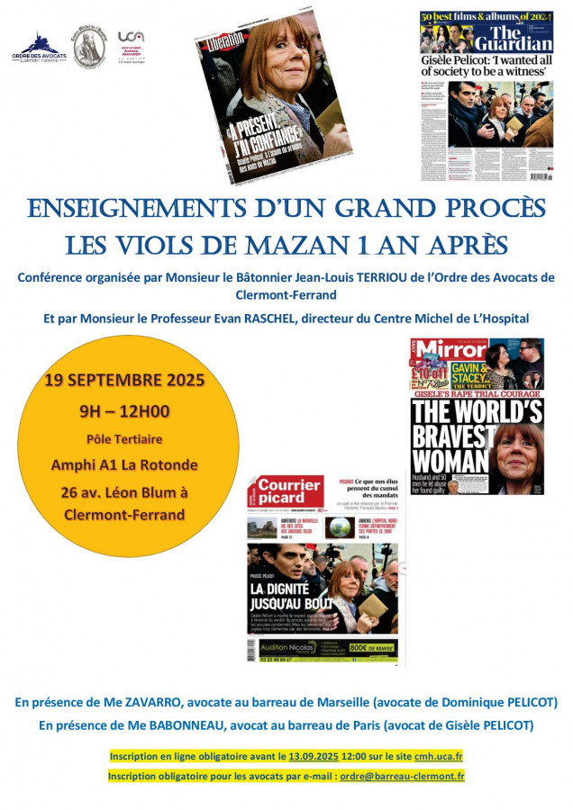 Inscription obligatoire avant le 13.09.2025 12h00 par le formulaire en ligne en bas de page : https://cmh.uca.fr/fr/navigation/manifestations-scientifiques/conference-les-viols-de-mazan