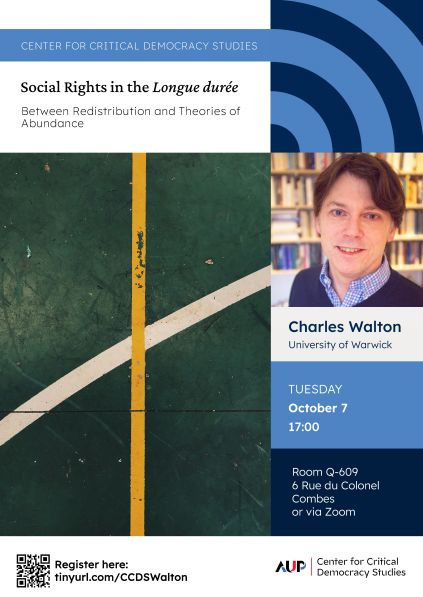 As historians have recently noted, economic and social rights have a long history. Far from being ‘second generation rights’ of the twentieth century, they are now seen as stretching back even further than the civil and political rights of the Enlightenment. This lecture will discuss how social rights since the late medieval period have been caught in a tension between two discourses : redistribution and theories of abundance – two discourses that have often been at odds with each other. Given the vexed nature of redistributive politics, theories of abundance have often been invoked as a panacea and alternative to redistribution. Occasionally, however, theories of abundance have been yoked to social rights, especially in modern revolutions. The lecture concludes by reflecting on how the advent of AI is reshaping this longstanding tension between a just redistribution and promises of abundance. Bio Charles Walton is Reader in History at the University of Warwick, where he has been Director of the Eighteenth Century Centre and of the European History Research Centre over the past decade. His research focuses on the French Revolution and human rights, especially the freedom of expression and social rights. He is co-editor, with Steven L. B. Jensen, of Social Rights and the Politics of Obligation in History (Cambridge, 2022). He recently co-wrote, with Charly Coleman, ‘Abstract and Embodied: The Political Economy of the French Revolution’ in French History (2024).