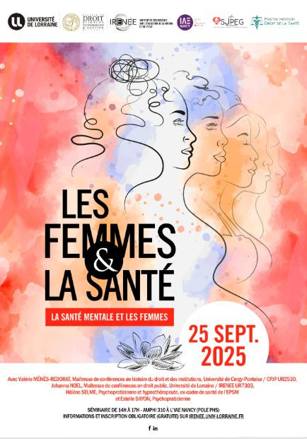 Cette conférence intitulée « Santé mentale et femmes » s’inscrit dans le projet inaugural pluridisciplinaire « Les femmes et la santé », sous la direction scientifique d’Eléonore Gigon, Fanny Grabias, Johanna Noel, MCF en droit public et Ludivine Laurent-Starck, IGR et Docteur en science politique, Université de Lorraine / IRENEE UR7303. La santé mentale a été posée comme une priorité nationale pour 2025. L’OMS a pu mettre en lumière la vulnérabilité accrue des femmes qu’elle attribuait notamment aux multiples rôles et responsabilités qu'elles assument (vie professionnelle et vie personnelle), les prédisposant davantage à de pression, de stress et donc de voir leur santé mentale sur-sollicitée. La santé mentale évolue au gré des bouleversements de la vie. Or, celle des femmes connaît une dégradation à la période de l’adolescence (v. par ex. Rapport AN, 2023), puis la vie adulte fait peser sur les femmes de nombreuses charges altérant leur santé : charge de la contraception, charge de la fécondité/maternité, charge mentale du foyer etc...