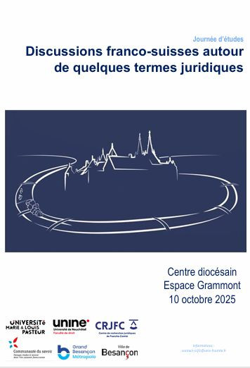 La présente journée d’études est organisée dans le prolongement de la parution du Dictionnaire juridique éclectique franco-suisse (Helbing Lichtenhahn/Presses universitaires de Franche-Comté, 2025). Elle s’inscrit dans le cadre des festivités de l’année du cinquantenaire du jumelage de Besançon et de Neuchâtel. Cette rencontre sera l’occasion de faire le point tant sur les problèmes juridiques rencontrés dans un contexte transfrontalier, que sur des questions de droit comparé franco-suisse. Les conférences seront prononcées par des binômes (CRJFC/UniNE) et s’adresseront aux étudiants de nos facultés de droit respectives et à un public constitué de professionnels du droit mais aussi de membres de la société civile intéressés par le droit et les problématiques transfrontalières.