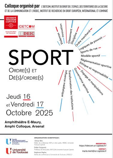 Deux ans après un premier colloque sur « Acteurs et valeurs du sport », un an après celui consacré au « Grandes dates et grandes figures du sport », le trio Idetcom – Irdeic - Cresco -soutenu par la Faculté de Droit de Toulouse Capitole et la Faculté des sciences du sport et du mouvement humain de l’Université de Toulouse- invite à porter un regard toujours pluriel, cette fois sur la thématique « Sport, ordre(s) et désordre(s) »