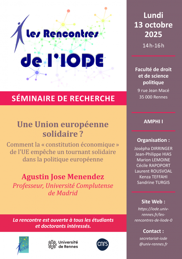 Lundi 13 octobre 2025, les "Rencontres de l'IODE" ont le plaisir d'accueillir Agustin José Menendez, professeur à l'Université Complutense de Madrid, qui présentera sa recherche intitulée : Une Union européenne solidaire ? Comment la "constitution économique" de l'UE empêche un tournant solidaire dans la politique européenne.