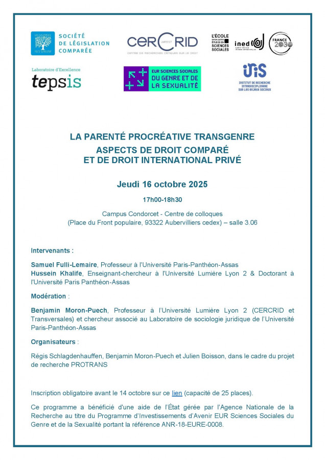 Inscription obligatoire avant le 14 octobre : https://evento.renater.fr/survey/conference-la-parente-procreative-transgenre-aspects-de-droit-compare-et-de-droit-international-prive-4sb1mfrl (capacité de 25 places)