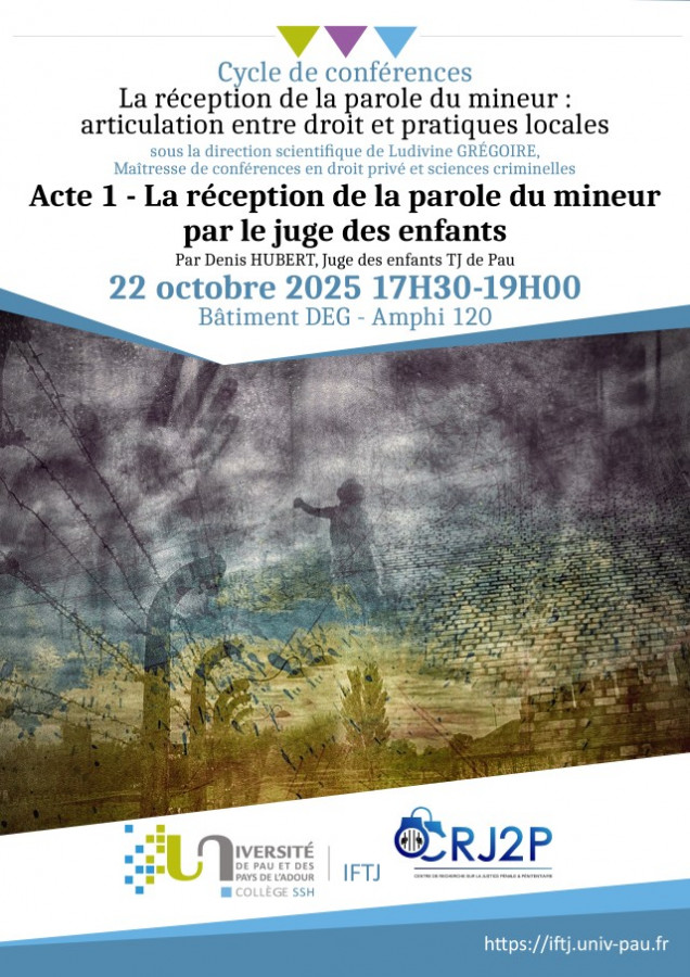 Conférence organisée par l'IFTJ et le CRJ2P, Université de Pau et Pays de l'Adour dans le cadre du cycle de conférences "La réception de la parole du mineur : articulation entre droit et pratiques locales", sous la direction scientifique de Ludivine Grégoire, Maîtresse de conférences en droit privé et sciences criminelles.