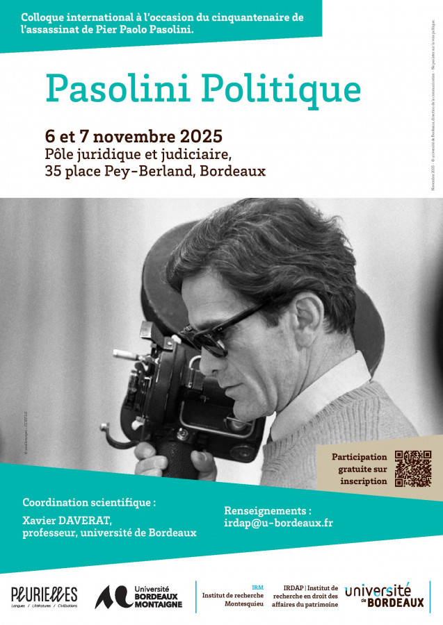 Colloque international organisé par l'IRDAP, Université de Bordeaux, l'IRM, Université de Bordeaux Montaigne et PLURIELLES à l’occasion du cinquantenaire de l’assassinat de Pier Paolo Pasolini sous la direction scientifique de Xavier Daverat, Professeur, Université de Bordeaux
