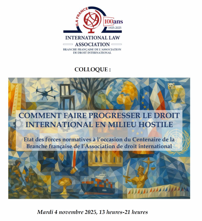 En 1925, la Branche française de l’Association de droit international (elle-même crée en 1873) a été fondée. Pour marquer son centenaire, l’association organise un colloque sur un thème lié à son rôle en matière de développement du droit international. Alors que les manifestations du 150e anniversaire de l’ADI/ILA en 2023, organisées à Paris par la Branche française, étaient centrées sur le contenu souhaitable du droit international de demain (voir notamment les livres blancs Gouvernance mondiale et Anthropocène, et le livre de conclusions), les réflexions seront focalisées sur les moyens et les méthodes permettant de faire progresser le droit international, en considération des exigences du monde actuel.