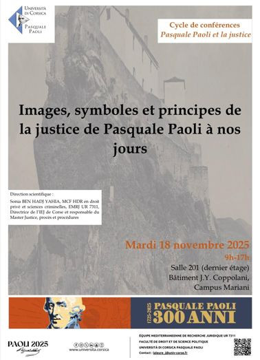 Dans le cadre de la commémoration du tricentenaire de la naissance de Pasquale Paoli, Sonia Ben Hadj Yahia organise, avec le soutien de l'EMRJ, un cycle de conférences diptyque sur le thème Pasquale Poli et la justice.