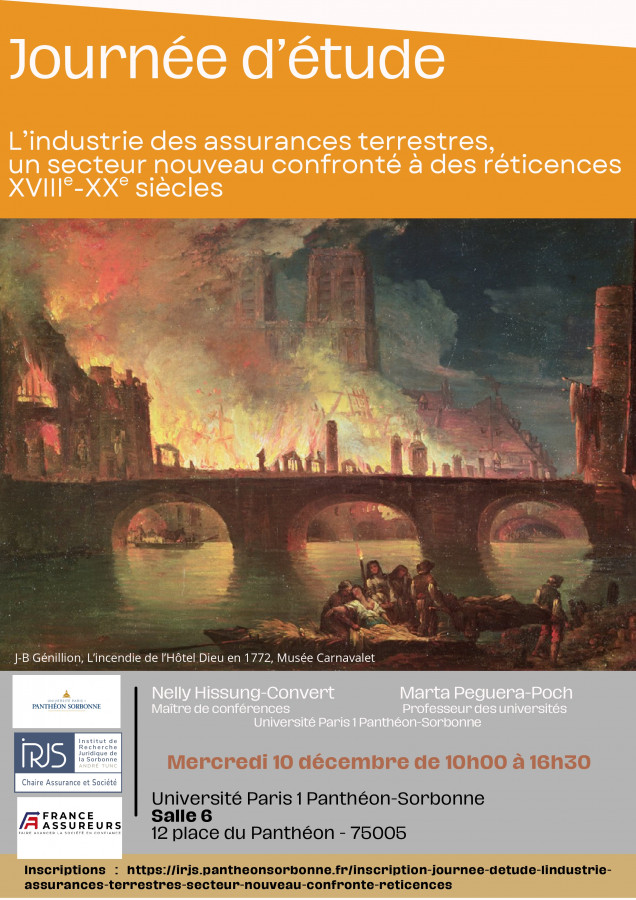 La journée d'étude, organisée à l'université Paris 1 Panthéon-Sorbonne dans le cadre de la chaire Assurance et Société, Historicité des savoirs et pratique de l'interdisciplinarité, vise à étudier, dans une perspective d'histoire du droit, comment l'industrie des assurances terrestres, innovante à la fin du XVIIIe siècle, s'est peu à peu enracinée et développée en faisant face à des réticences à la fois politiques, juridiques et économiques, avant de devenir un véritable acteur de notre économie moderne
